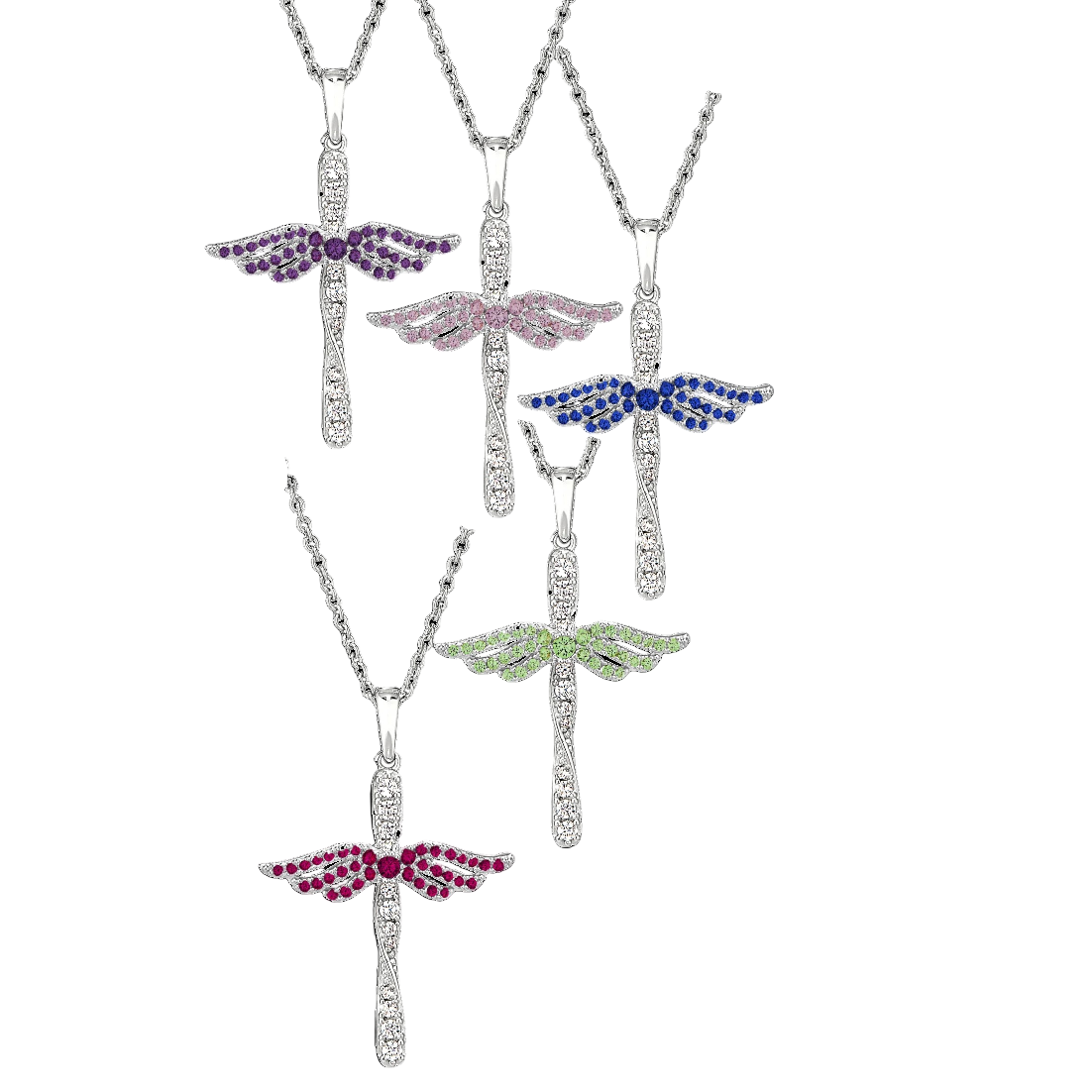925 Platinum Vermeil Dangle Angel Cross Pendant Featuring Round shaped Cubic Zirconium. Regularly $149.95 Now $99