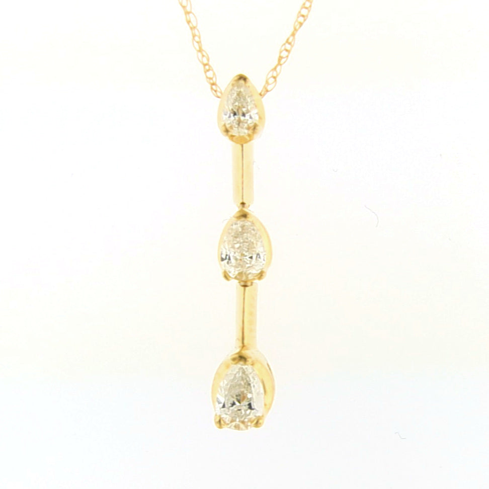 14 Karat Yellow Gold Three Stone Slide Pendant Featuring Pear Shaped Diamonds Appearing SI in Clarity , H/I in Color With an Approximate Total Weight of 0.47cts Set in Three Prong Setting . Suspended by Pendant Rope Chain Measuring 18 Inch inches Long With Spring Ring Clasp.