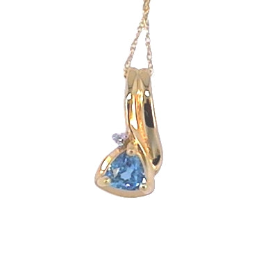 14 Karat Yellow Gold Geometric with Hidden Bail Pendant Featuring Trillian Shaped Topaz , Swiss Blue in Color and Measuring 5mm With an Approximate Total Weight of 0.65cts Set in Three Prong Setting, Accented with Three Prong set Diamond Weighing Approx. 0.01ctw. Suspended by Pendant Rope Chain Measuring 18 Inch inches Long With Spring Ring Clasp.