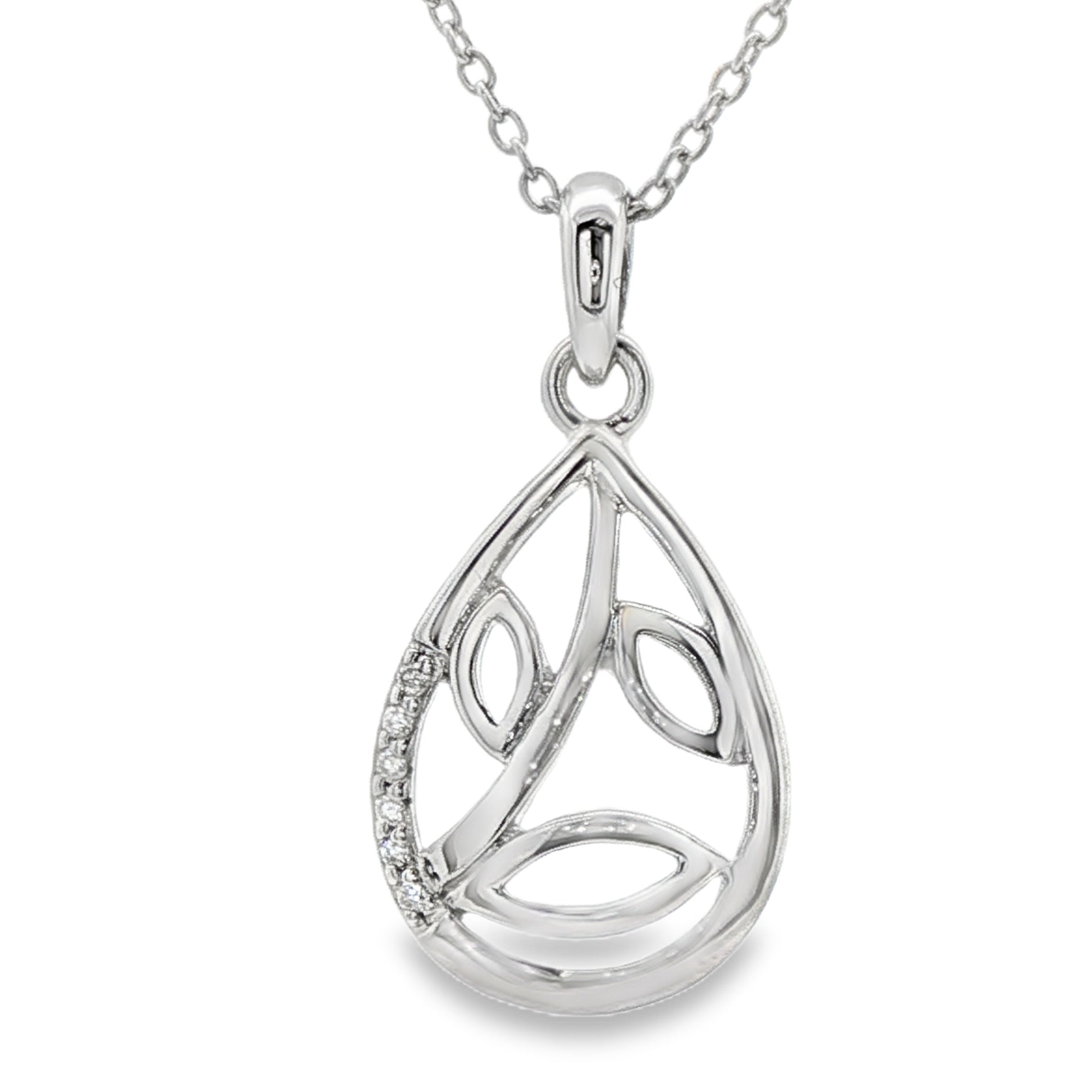 925 Sterling Silver Dangle Tear Drop Pendant Featuring Round Brilliant shaped Diamonds, with an approximate total weight of 0.03cts set in Shared Prong setting . Suspended by Cable Link chain Measuring 18 Inches Long With Lobster Clasp.