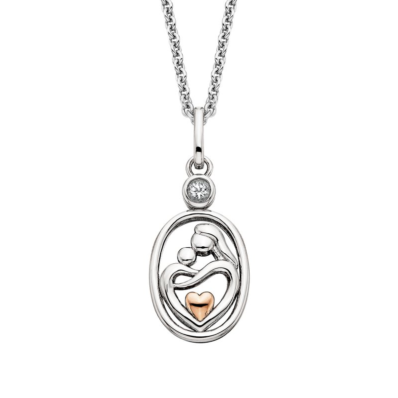 925 Sterling Silver and Rose Gold Dangle Family Pendant Featuring Round shaped Topaz, White in color, set in Bezel setting . Suspended by Cable Link chain Measuring 18 Inches Long With Spring Ring Clasp.