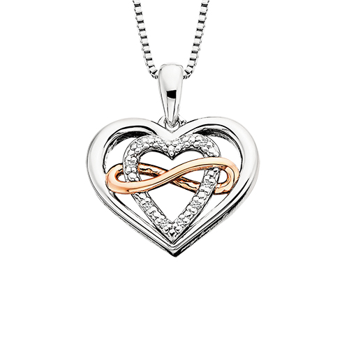 925 and 18K Sterling Silver and Rose Gold "You've Captured My Heart" Infinity Heart Dangle Pendant. Featuring Round Brilliant Shaped Diamonds Appearing I1 in Clarity , I in Color With an Approximate Total Weight of 0.03cts Suspended by Box Chain Measuring 18 Inches Long With Lobster Clasp.