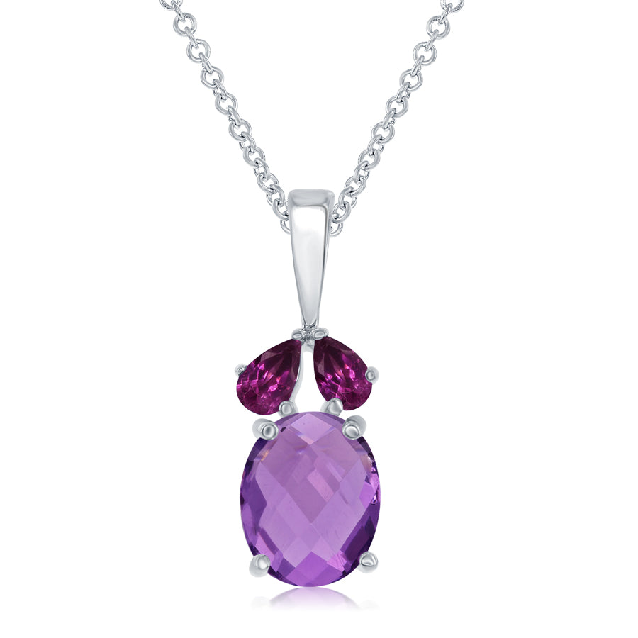 925 Sterling Silver Drop Three Stone Pendant Featuring Oval Shaped Amethyst and Measuring 10mm x 8mm Set in Four Prong Setting and Accented with Three Prong set Amethysts .