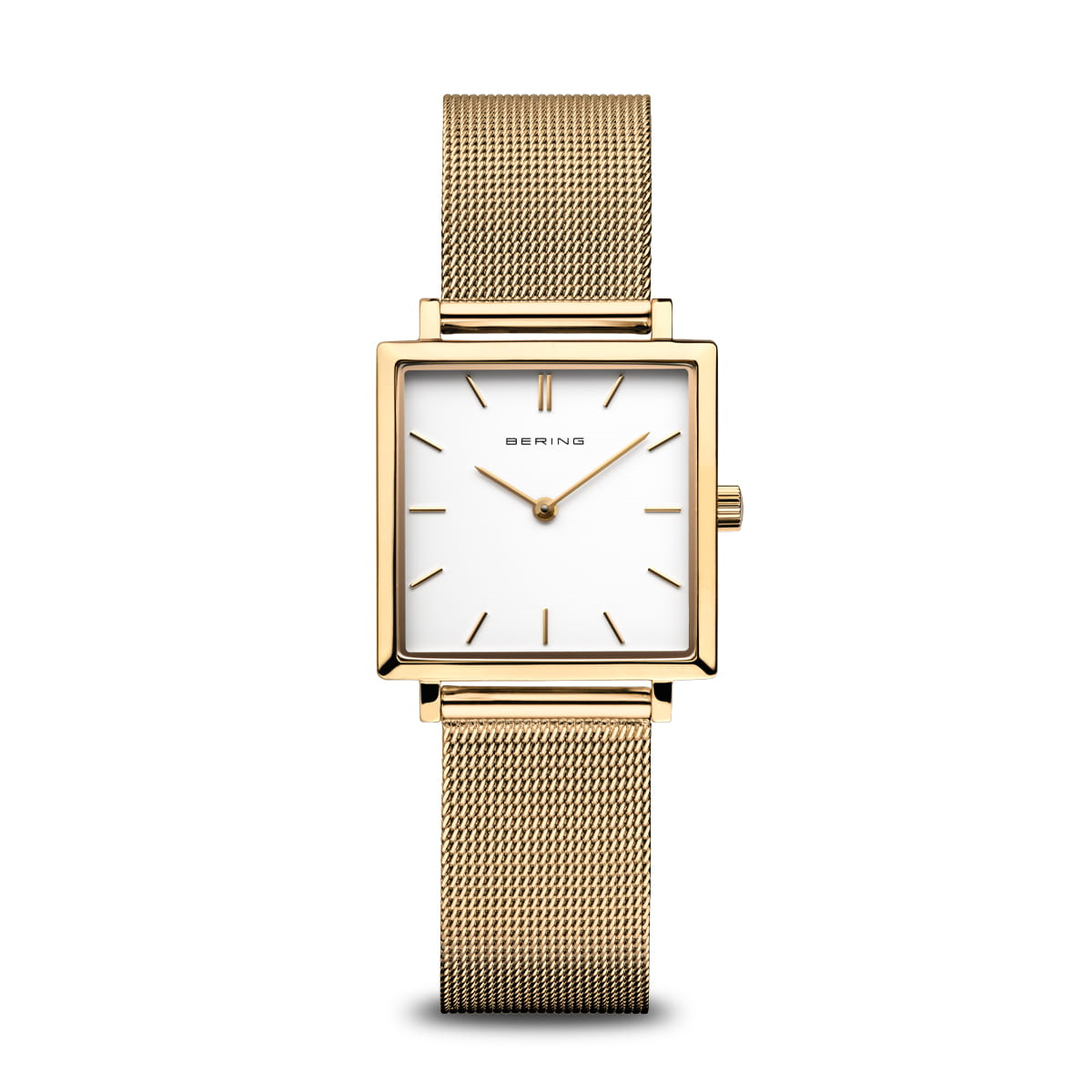 Quartz Yellow Gold Tone Watch With Stainless Steel Case, Measuring 26mm Featuring a White Dial With Two Hands Function and Sapphire Crystal Crystal With a Water Resistance Rating of ( 300 Meters ) Attached to Metal Mesh Band.